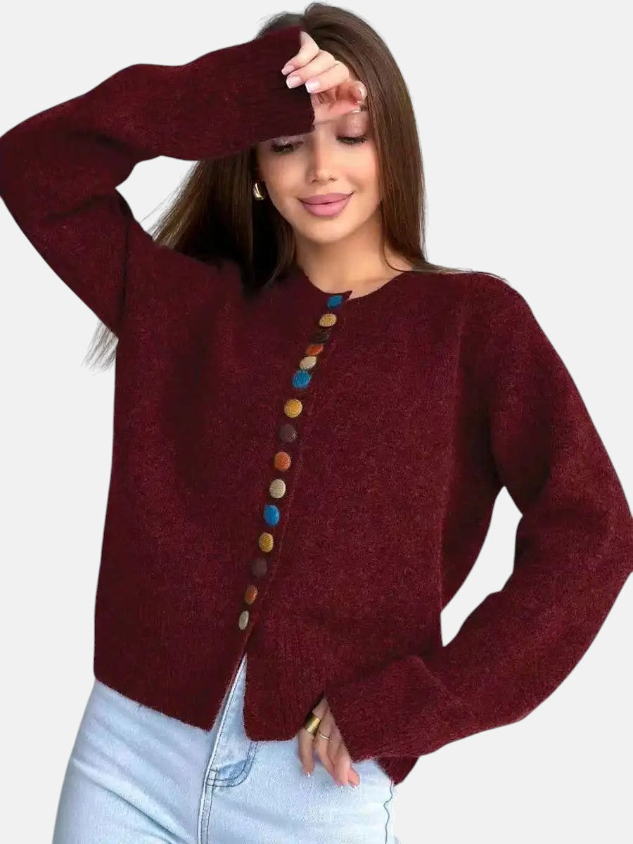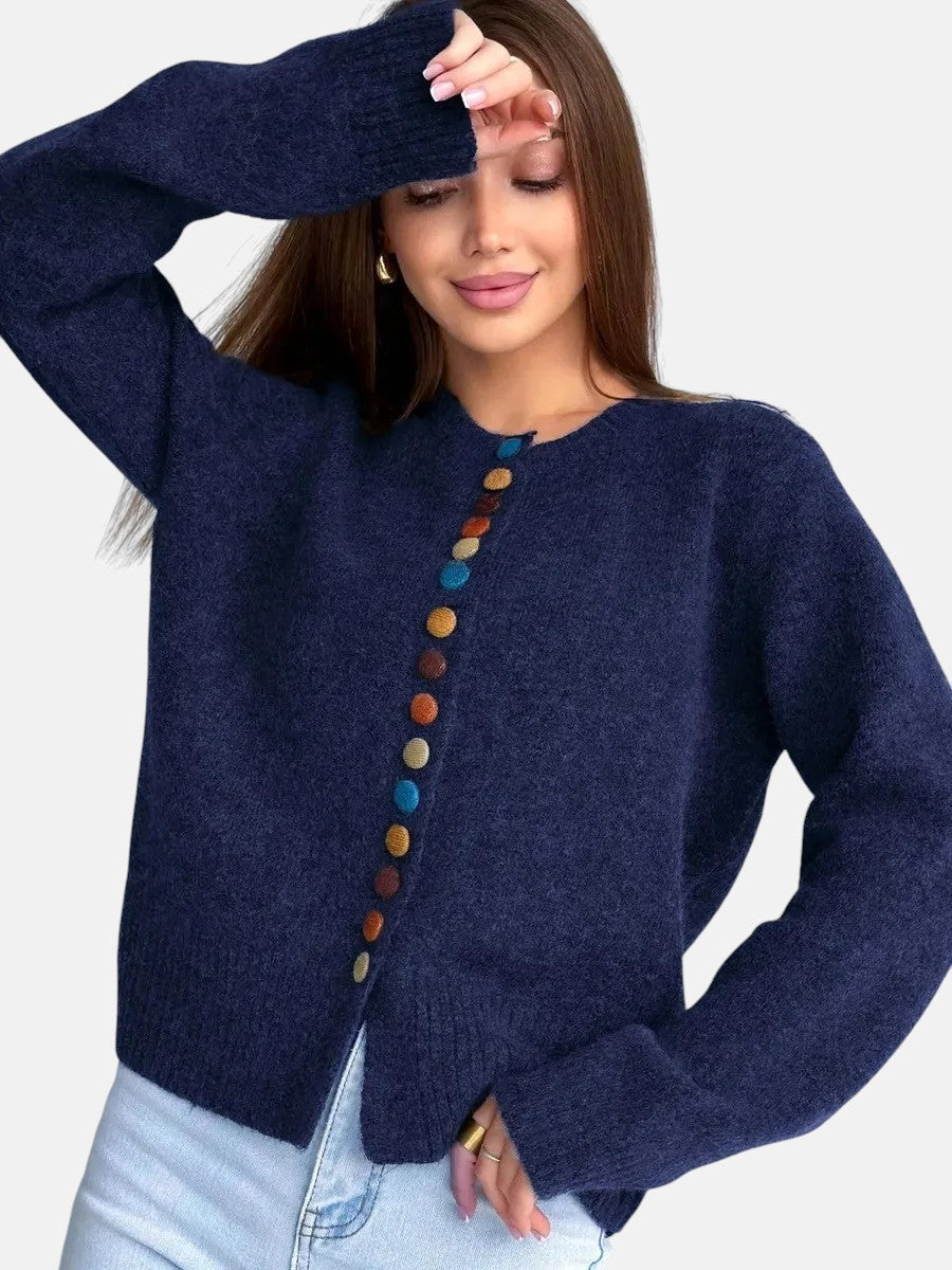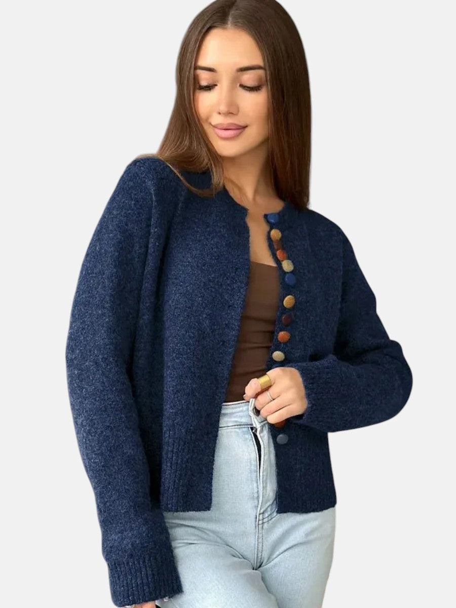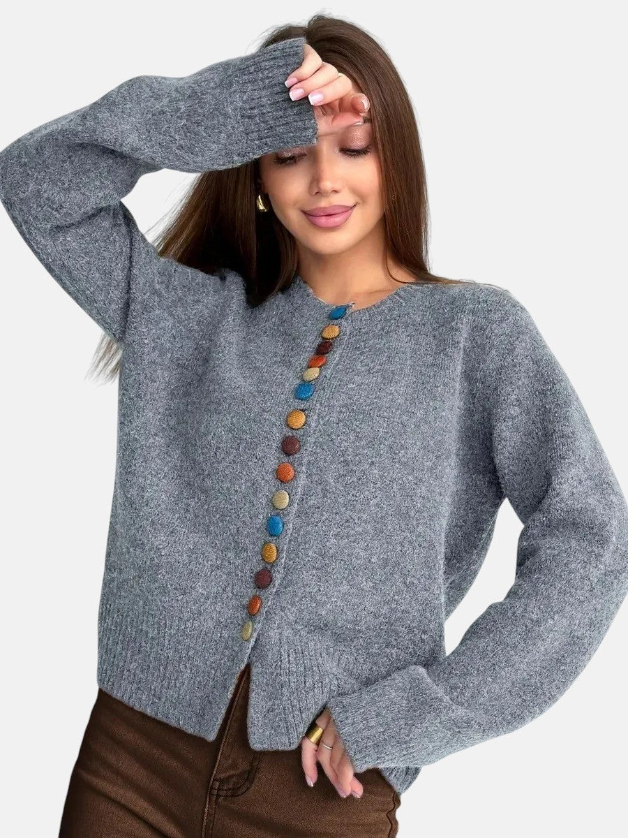 - Игриви акценти с бутони: Цветни бутони добавят характер и чар на класическия кардиган.