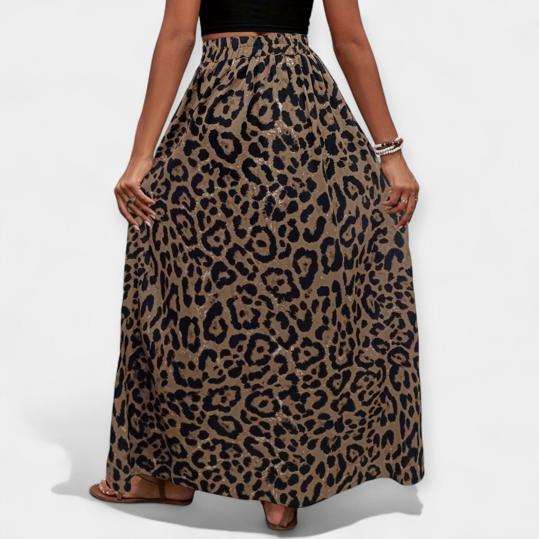 Тази миди пола с леопардов принт обгръща женствеността с динамика и представляваultимативно модно изявление за лятото. Разрезът в долната част добавя движение и съблазнителност, докато удобният крой я прави идеална за всеки момент от деня.
