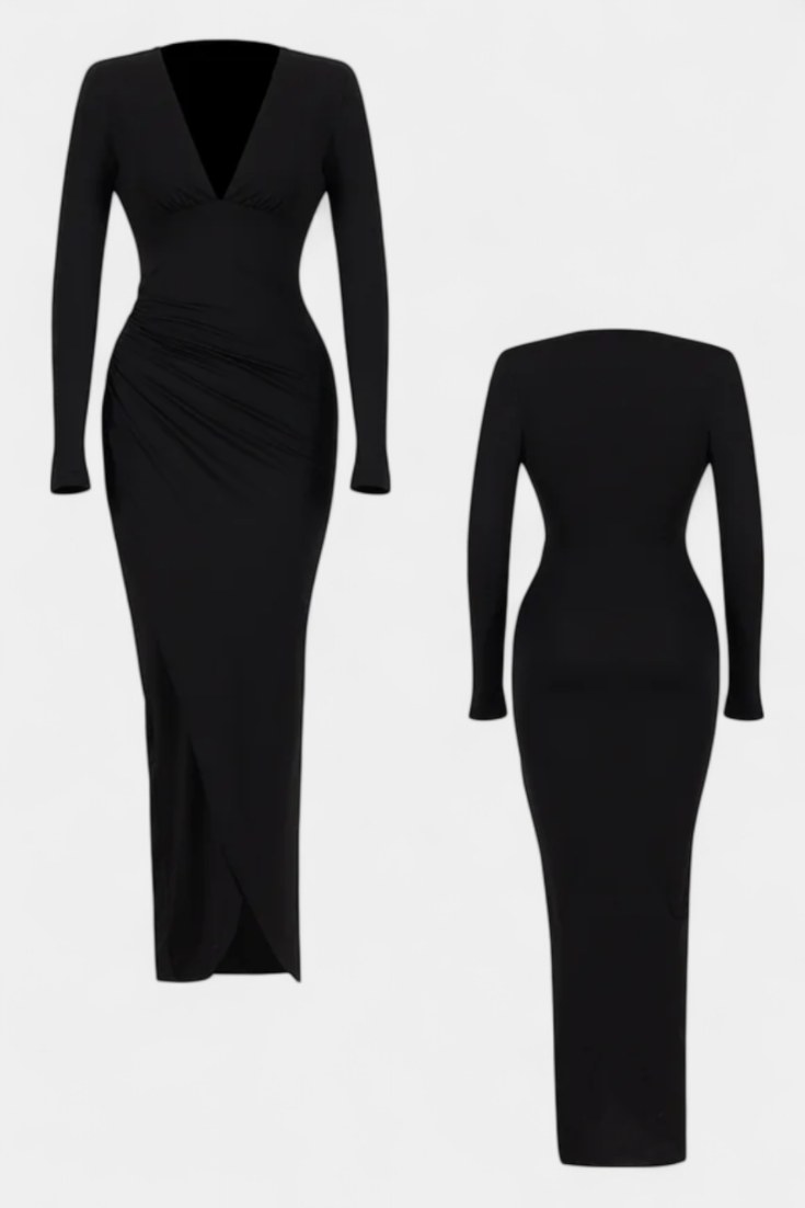 Елегантна и извечна, роклята Елена е проектирана да подчертае фигурата с перфектен баланс между изисканост и универсалност. Нейното дълбоко V деколте създава женствена и стройна силуета, докато деликатното плисиране добавя финно движение и рафиниран вид. Дългите ръкави я правят идеално облекло за свежи сезони или формални поводи, когато искате да се откроите с елегантност.