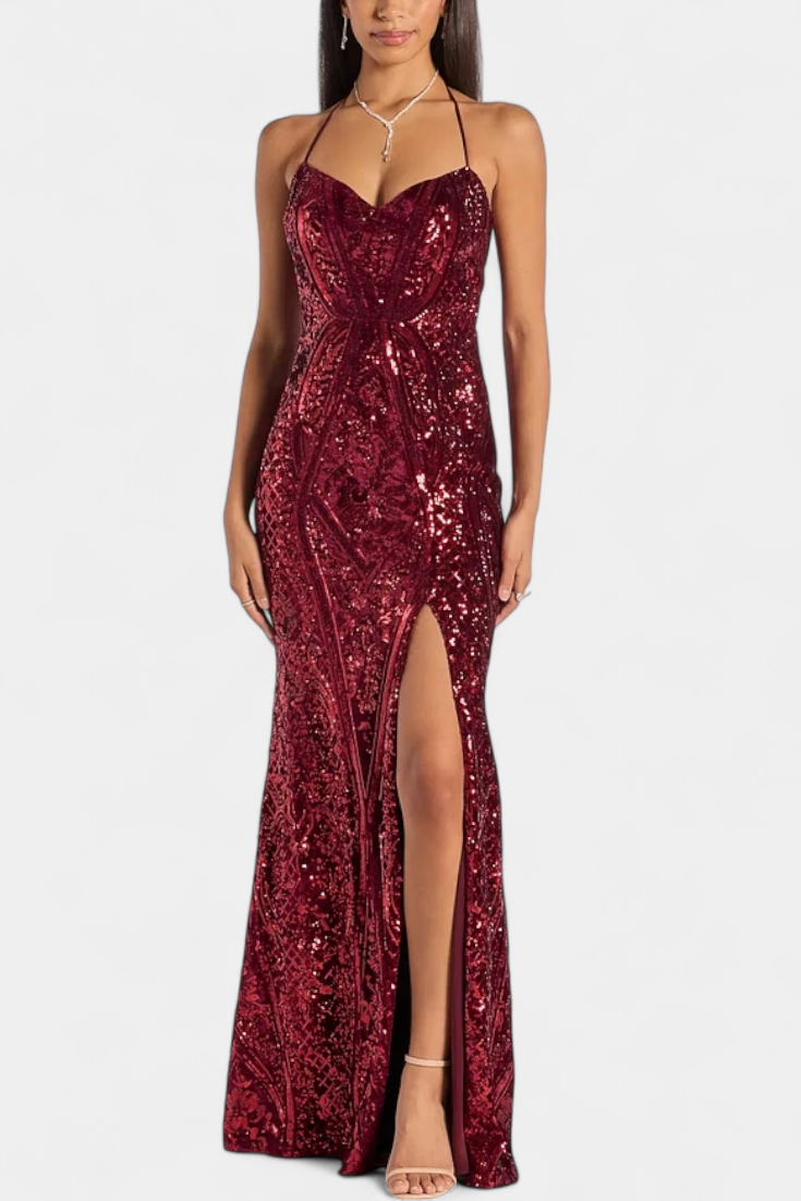Металик рокля с отворен гръб и висок разрез Бояна Халтер